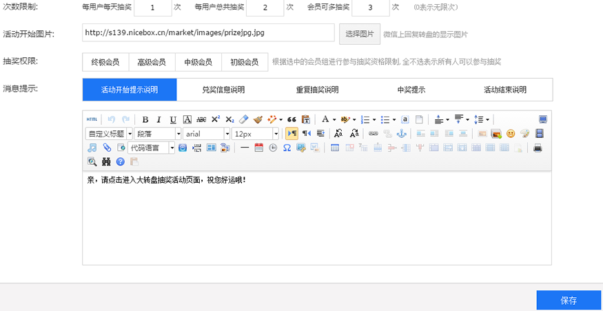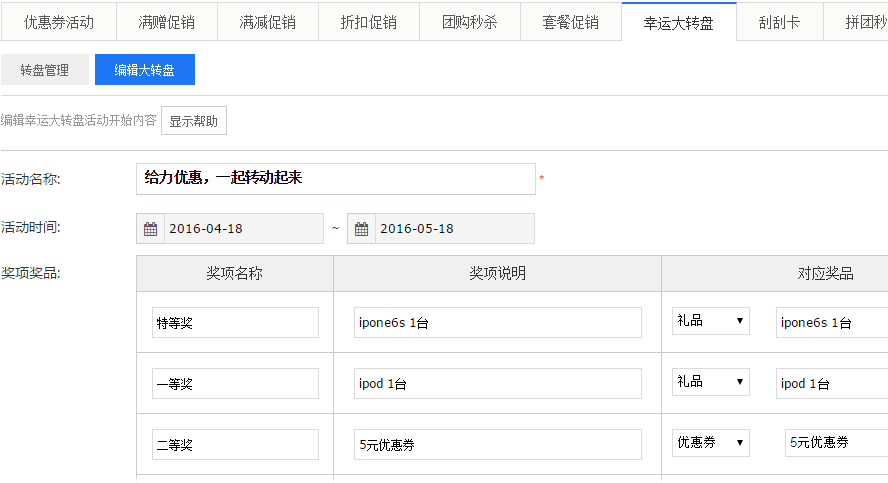 大轉(zhuǎn)盤(pán)為商家提供轉(zhuǎn)盤(pán)抽獎(jiǎng)服務(wù),商家只需設(shè)置活動(dòng)時(shí)間、活動(dòng)規(guī)則、活動(dòng)獎(jiǎng)品等信息就能發(fā)起活動(dòng),粉絲進(jìn)入活動(dòng)界面,點(diǎn)擊開(kāi)始抽獎(jiǎng),即有幾率獲得不同類(lèi)型的獎(jiǎng)品。