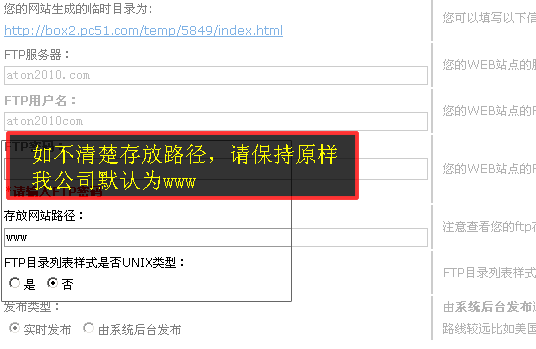 如果是獨立購買的曙光云站,還需要輸入ftp服務器中的網站目錄等信息,如不清楚請保持原樣,或者咨詢主機提供商業。