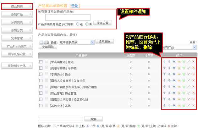 2、設(shè)置“郵件通知”,產(chǎn)品管理操作可對(duì)產(chǎn)品進(jìn)行移動(dòng)、推薦、上架、編輯、刪除等操作。