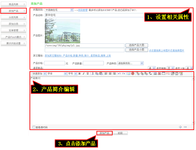 3、添加產(chǎn)品,可以對(duì)產(chǎn)品進(jìn)行“屬性設(shè)置”,編輯好“產(chǎn)品簡(jiǎn)介”后點(diǎn)擊“添加產(chǎn)品