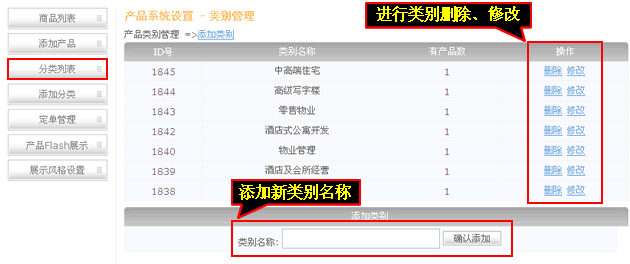 4、分類產(chǎn)品,可以添加、修改、刪除產(chǎn)品分類