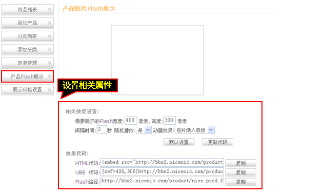 6、產(chǎn)品FLASH屬性可以設(shè)置產(chǎn)品展示FLASH效果
