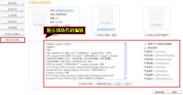 7、產(chǎn)品展示風(fēng)格可以“自由編輯產(chǎn)品展示風(fēng)格代碼”,右側(cè)有產(chǎn)品的各項(xiàng)參數(shù)