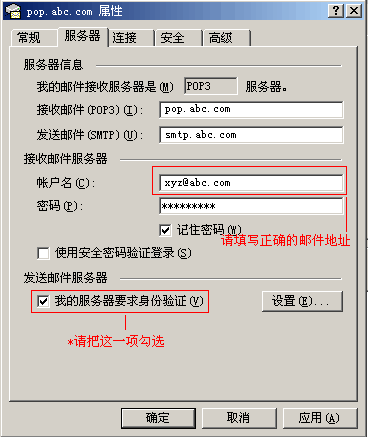 請點擊服務器選項,填寫正確的郵件地址,把“我的服務器要求身份驗證”這一項選上。