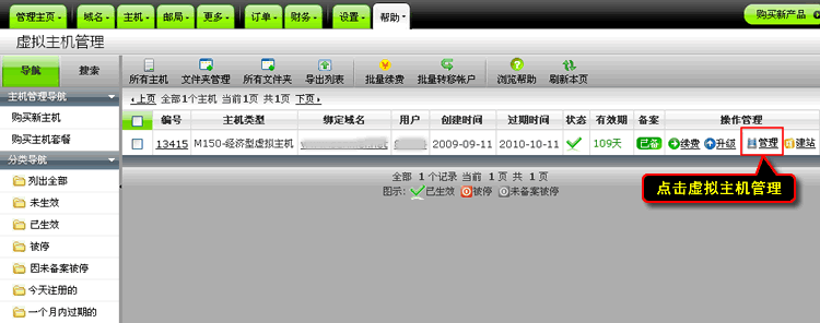 1、進入控制中心的“虛擬主機管理”,點擊主機右邊的“管理”